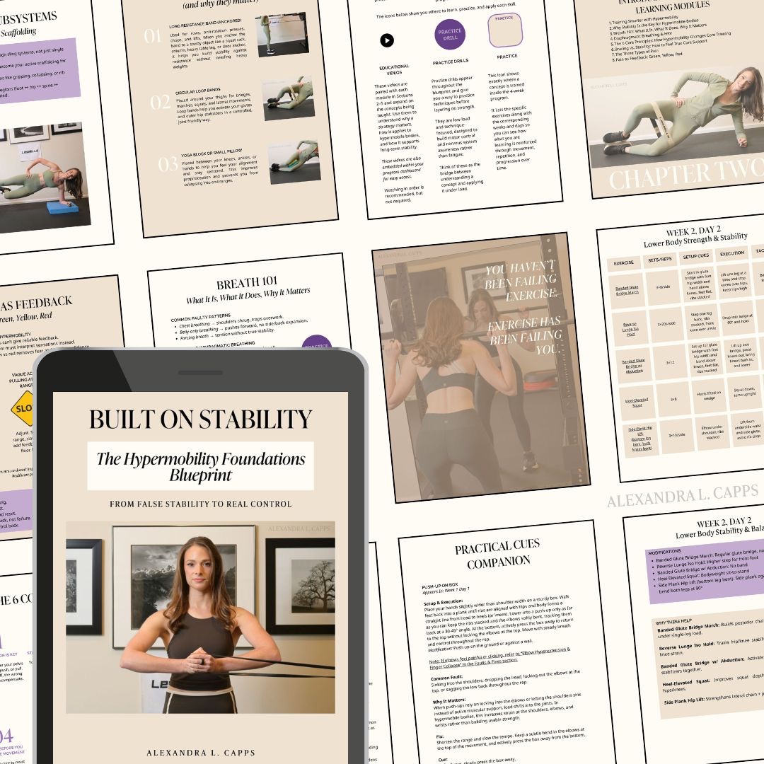 A foundational stability system for hypermobile women that teaches how joint support is created through breath, alignment, and integrated muscle systems, so movement feels controlled, supported, and sustainable.